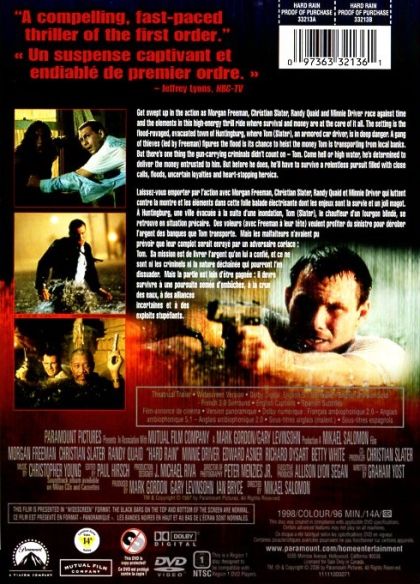 Weather forecast: rain. Action forecast: Hard Rain, the torrential, excitement-swept thriller featuring a screenplay from the writer of Speed and the on-screen talents of Morgan Freeman (Deep Impact), Christian Slater (Broken Arrow), Randy Quaid (Independence Day) and Minnie Driver (Good Will Hunting).The setting is the flood-ravaged, evacuated town of Huntingburg, where armored car driver Tom (Slater) is in deep danger. A gang of thieves (led by Freeman) figures the flood is its chance to heist the $3 million Tom's transporting from local banks. But there's one thing the gun-carrying criminals don't count on--Tom. Come hell, high water or both, he's determined to deliver the money entrusted to him. But before he does, he'll have to survive a relentless pursuit filled with close calls, ever-rising waters, uncertain loyalties and heart-stopping heroics.Laissez-vous emporter par l'action avec Morgan Freeman, Christian Slater, Randy Quaid et Minnie Driver qui luttent contre la montre et les éléments dans cette folle balade électrisante dont les enjeux sont la survie et un joli magot. À Huntingburg, une ville évacuée à la suite d'une inondation, Tom (Slater), le chauffeur d'un fourgon blindé, se retrouve en situation précaire. Des voleurs (avec Morgan Freeman à leur tête) veulent profiter du sinistre pour dérober l'agent des banques que Tom transporte. Mais les malfaiteurs n'avaient pu prévoir que leur complot serait enrayé par un adversaire coriace : Tom. Sa mission est de livrer l'argent qu'on lui a confié, et ce ne sont ni les criminels ni la nature déchaînée qui pourront l'en dissuader. Mais la partie est loin d'être gagnée : il devra survivre à une poursuite semée d'embûches, à la crue des eaux, à des alliances incertaines et à des exploits stupéfiants.