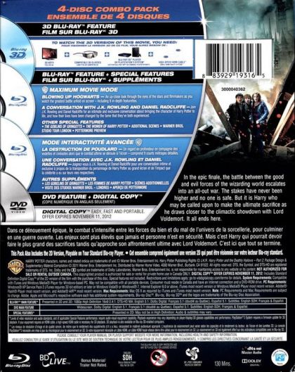 In the epic finale, the battle between the good :and evil forces of the wizarding world escalates into an all-out war. The stakes have never been higher and no one is safe. But it is Harry who may be called upon to make the ultimate sacrifice as he draws closer to the climactic showdown with Lord Voldemort. It all ends here.Dans ce dénouement épique, le combat s’intensifie entre les forces du bien et du mal de l’univers de la sorcellerie, pour culminer en une guerre ouverte. Les enjeux sont plus élevés que jamais et personne n'est en sécurité. Mais c'est Harry qui pourrait devoir faire le plus grand des sacrifices tandis qu'approche son affrontement ultime avec Lord Voldemort. C'est ici que tout se termine.