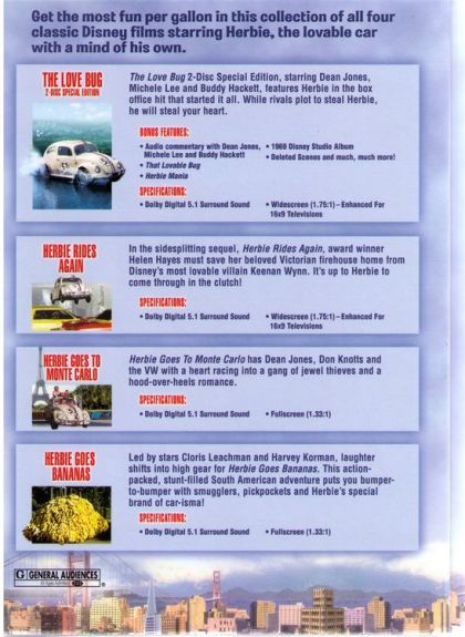 Get the most fun per gallon in this collection of all four classic Disney films starring Herbie, the lovable car with a mind of his own."The Love Bug" 2-Disc Special EditionThe Love Bug 2-Disc Special Edition, starring Dean Jones, Michele Lee and Buddy Hackett, features Herbie in the box office hit that started it all. While rivals plot to steal Herbie, he will steal your heart."Herbie Rides Again"In the sidesplitting sequel, Herbie Rides Again, award winner Helen Hayes must save her beloved Vicgtorian firehouse home from Disney's most lovable villain Keenan Wynn. It's up to Herbie to come through in the clutch!"Herbie Goes to Monte Carlo"Herbie Goes to Monte Carlo has Dean Jones, Don Knotts and the VW with a heart racing into a gang of jewel thieves and a hood-over-heels romance."Herbie Goes Bananas"Led by stars Cloris Leachman and Harvey Korman, laughter shifts into high gear for Herbie Goes Bananas. This action-packed, stunt-filled South American adventure puts you bumper-to-bumper with smugglers, pickpockets and Herbies special brand of car-isma!