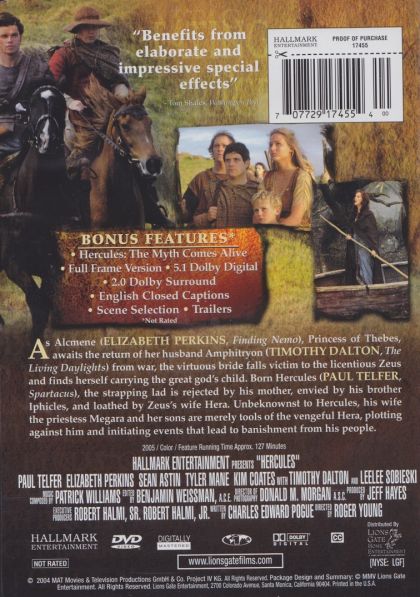 Half God. Half Man. All Power.As Alcmene (Elizabeth Perkins, Finding Nemo), Princess of Thebes, awaits the return of her husband Amphitryon (Timothy Dalton, Living Daylights) from war, the virtuous bride falls victim to the licentious Zeus and finds herself carrying the great god's child. Born Hercules (Paul Telfer, Spartacus), the strapping lad is rejected by his mother, envied by his brother Iphicles, and loathed by Zeus's wife Hera. Unbeknownst to Hercules, his wife the priestess Megara and her sons are merely tools of the vengeful Hera, plotting against him and initiating events that lead to the banishment from his people.