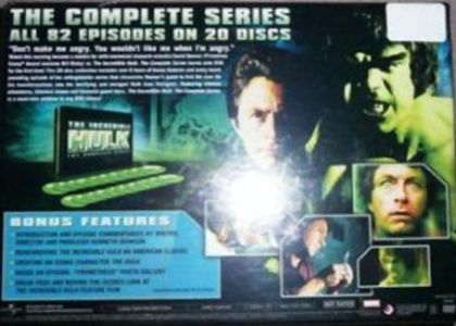 THE COMPLETE SERIESALL 82 EPISODES ON 20 DISCS"Don't make me angry, you wouldn´t like me when I'm angry."Watch this warning become a mantra for mid-mannered research scientist David Banner (Primetime Emmy Award nominee Bill Bixby) as The Incredible Hulk: The Complete Series bursts onto DVD the first time! This 20-disc collection includes over 6 hours of bonus features and every heart-pounding episode of the unforgettable series that cronicles Banner's quest to find the cure for his transformations into the terrifying and enraged Hulk (Lou Ferrigno). Featuring intense adventures, timeless drama and fantastic guest stars, The Incredible Hulk: The Complete Series is a must-own addition to any DVD library!