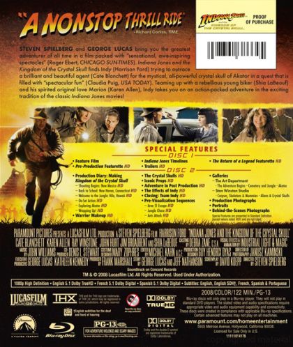 STEVEN SPIELBERG and GEORGE LUCAS bring you the greatest adventurer of all time in a film packed with "sentational awe-inspiring spectacles" (Roger Ebert, CHICAGO SUN-TIMES). Indiana Jones and the Kingdom of the Crystal Skull find Indy (Harrison Ford) trying to outrace a brillant and beautiful agent (Cate Blanchett) for the mystical, all-powerful crystal skull of Akator in a quest that is filled with "spectacular fun" (Claudia Puig, USA TODAY). Teaming up with a rebellious young biker (Shia Labeouf) and his spirited original love Marion (Karen Allen), Indy taked you on an action-packed adventure in the exciting tradition of the classic Indiana Jones movies!STEVEN SPIELBERG et GEORGE LUCAS présentent le plus grand aventurier de tous les temps dans un film bourré de «scènes stupéfiantes» (Roger Ebert, CHICAGO SUN-TIMES). Dans Indiana Jones et le Royaume du crâne de cristal, Indy (Harrison Ford) tente de devancer une brillante et ravissante espionne (Cate Blanchett) à la recherche du mystique et tout-puissant crâne de cristal d'Akator dans une quête «spectaculaire et réjouissante» (Claudia Puig, USA TODAY). Faisant équipe avec un jeune motard rebelle (Shia Labeouf) et son premier amour, l'impétueuse Marion (Karen Allen), Indy vous entraîne dans une aventure palpitante fidèle à la tradition des films classiques d'Indiana Jones!
