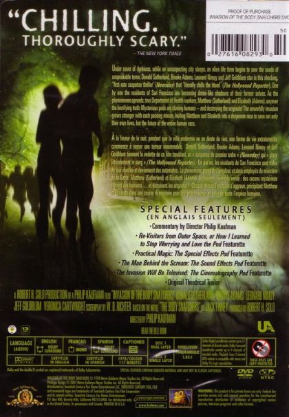 Under cover of darkness, while an unsuspecting city sleeps, an alien life form begins to sow the seeds of unspeakable terror. Donald Sutherland, Brooke Adams, Leonard Nimoy and Jeff Goldblum star in this shocking, "first-rate suspense thriller" (Newsday) that "literally chills the blood" (The Hollywood Reporter).One by one the residents of San Francisco are becoming drone-like shadows of their former selves. As the phenomenon spreads, two Department of Health workers, Matthew (Sutherland) and Elizabeth (Adams), uncover the horrifying truth: Mysterious pods are cloning humans - and destroying the originals! The unworldly invasion grows stronger with each passing minute, hurling Matthew and Elizabeth into a desperate race to save not only their own lives, but the future of the entire human race.