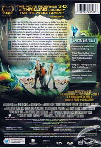 Brendan Fraser stars in this action-packed adventure based on the Jules Verne classic that is sure to deliver fun for the whole family! On a hunch to find the center of the earth, Trevor Anderson (Fraser), his nephew and their tour guide make a breakthrough discovery that launches them on a thrilling journey into the unknown. On a scramble find their way back, the group travels through a never-before-seen world, encountering creatures and objects never imagined. Whether in 3-D with glasses or in 2-D, get close to the engage your sense of wonder and take your own journey to the center of the earth! Brendan Fraser tient la vedette de cette aventure remplie d'action inspirée par le classique de Jules Verne et dont toute la famille raffolera! Partis sur un coupe de tête trouver le centre de la terre, Trevor Anderson (Fraser), son neveu et leur guide touristique font une découverte fabuleuse qui les plonge dans un périple palpitant au coeur de l'inconnu. Le petit groupe y découvre un monde inexploré peuplé de créatures et d'objets qui dépassent l'imagination. Que ce soit en 3D avec des lunettes* ou en 2D vous adorerez vous rapprocher de l'action, participer à l'émerveillement et partir pour votre propre équipée au centre de la terre!