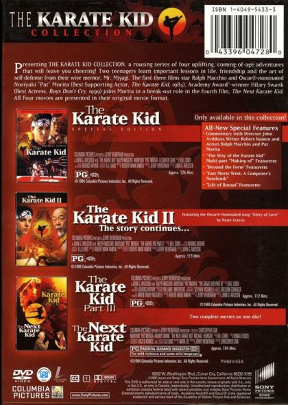 Presenting The Karate Kid Collection, a rousing series of four uplifting, coming of age adventures that will leave you cheering! Two teenagers learn important lessons in life, friendship and the art of self-defense from their wise mentor, Mr. Miyagi. The first three films star Ralph Macchio and Oscar nominated Noriyuki "Pat" Morita (Best Supporting Actor, The Karate Kid, 1984), Academy Award winner Hilary Swank (Best Actress, Boys Don't Cry, 1999) joins Morita in a break out role in the fourth film, The Next Karate Kid. All four movies are presented in their original movie format.