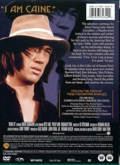The adventure continues for Kwai Chang Caine (David Carridine), a Shaolin Priest trained in the wisdom and warfare of China's ancients and following his life's path in the American West of the latter 1800s. Caine still searches for his half-brother Danny. A dead-or-alive bounty still hangs over his head. Yet Caine remains calm and resourceful. "I live. I rest. I am at peace. It is good," he says.Good, too, is this 4-disc set of Season Two's 23 episodes whose many guest stars include Harrison Ford, Don Johnson, Slim Pickens, Gilbert Roland, Tina Louise, John Carradine, and Benson Fong.Snatch the pebble from our hand... and continue the journey.