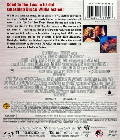 He's in this game for keeps: Bruce Willis is a P.I. tackling corruption inside pro football, and the deadly line of scrimmage stretches all across L.A. in The Last Boy Scout. Daman Wayans and Halle Berry costar, and director Tony Scott (Top Gun) ramps up the punches and punchlines. As a tight-lipped man of mystery who realizes he can profit by working both sides of a Prohiition Era gang fued, Willis has a gun in each hand and no end of ammo in Last Man Standing. Christopher Walken and Michael Imperioli add to the action arsenal directed with flair by Walter Hill (48 Hrs.) and previously casptured on film in Yojimbo and A Fistful of Dollars.