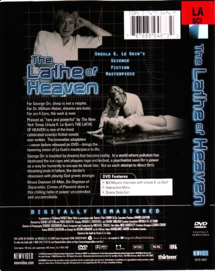 For George Orr, sleep is not a respite. For Dr. William Haber, dreams are tools. For sci-fi fans, the wait is over.Praised as "rare and powerful" by The New York Times, Ursula K. Le Guin's The Lathe Of Heave is one of the most celebrated science fiction novels ever written. This innovative adaptation -- never before released on DVD -- brings the towering vision of Le Guin's masterpiece to life.George Orr is haunted by dreams that become reality. In a world where pollution has destroyed the ice caps and plagues rage unchecked, a psychiatrist sees Orr's power as a way for humanity to escape it's bleak fate. But as each attempt to direct Orr's dreaming ends in failure, the doctor's obsession with playing God grows stronger.Bruce Davison (X-Men, Six Degrees Of Separation, Crimes of Passion) stars in this chilling fable of power uncontrolled and uncontrollable.