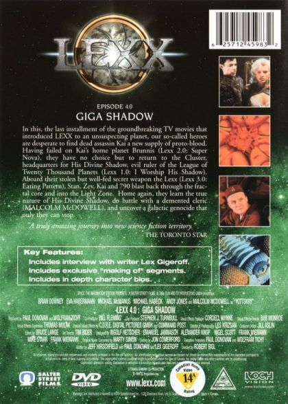 Giga ShadowIn this, the last installment of the ground breaking TV movies that introduced LEXX to an unsuspecting planet, our so-called heroes are desperate to find dead assassin Kai a new supply of proto-blood. Having failed on Kai’s home planet Brunnis (Lexx 2.0: Super Nova), they have no choice but to return to the Cluster, headquarters for His Divine Shadow, evil ruler of the League of Twenty Thousand Planets (Lexx 1.0: I Worship His Shadow). Aboard their stolen but well-fed secret weapon the Lexx (Lexx 3.0: Eating Pattern), Stan, Zev, Kai and 790 blast back through the fractal core and into the Light Zone. Home again, they learn the true nature of His Divine Shadow, do battle with a demented cleric (MALCOLM McDOWELL), and uncover a galactic genocide that only they can stop.