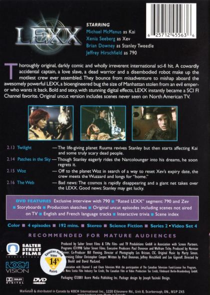"Inventive, gory, scary and funny, often all at the same time." -London Evening StandardThoroughly original, darkly comic and wholly irreverent international sci-fi hit. A cowardly accidental captain, a love slave, a dead warrior and a disembodied robot make up the motliest crew ever assembled. They bounce from misadventure to mishap aboard the awesomely powerful LEXX, a bioengineered bug the size of Manhattan stolen from an evil emperor who wants it back. Bold and sexy, with stunning digital effects, LEXX instantly became a SCI FI Channel favorite. Original uncut version includes never seen on American TV.2.13 Twilight - The life-giving planet Ruuma revives Stanley but then starts affecting Kai and some truly scary dead people.2.14 Patches in the Sky - Though Stanley eagerly rides the Narcolounger into his dreams, he soon regrets it.2.15 Woz - Off to the planet Woz in search of a way to reset Xev's expiry date, the crew meets the Wuzzard and longs for "home."2.16 The Web - Bad News: The cosmos is rapidly disappearing and a giant net takes over the LEXX. Good news: Stanley may get lucky.