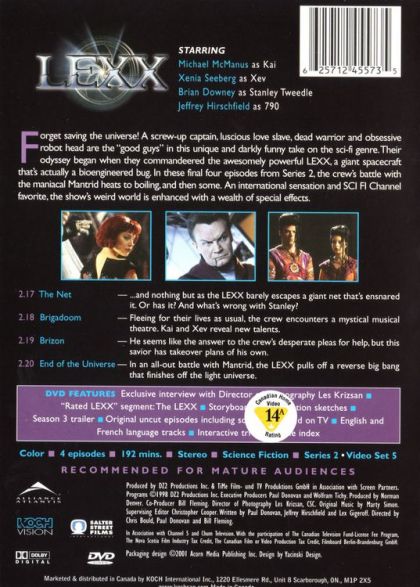 LEXXStarring Michael McManus as Kai Xenia Seeberg as Xev Brian Downey as Stanley Tweedle Jeffrey Hirschfield as 790Forget saving the universe! A screw-up captain, lucsious love slave, dead warrior and obsessive robot head are the "good guys" in this unique and darkly funny take on the sci-fi genre. Their odyssey began when they commandeered the awesomely powerful LEXX, a giant spacecraft that's actually a bioengineered bug. In these final four episodes from Series 2, the crew's battle with the maniacle Mantrid heats to boiling, and then some. An international sensation and SCI FI Channel favorite, the show's weird world is enhanced with a wealth of special effects.2.17: The Net -- ...and nothing but as the LEXX barely escapes a giant net that's ensnared it. Or has it? And what's wrong with Stanley?2.18: Brigadoom -- Fleeing for their lives as usual, the crew encounters a mystical musical theatre. Kai and Xev reveal their new talents.2.19 Brizon -- He seems like the answer to the crew's desperate pleas for help, but this savior has takeover plans of his own.2.20 End of the Universe -- In an all-out battle with Mantrid, the LEXX pulls off a reverse big bang that finishes off the light universe.DVD Features: Exclusive interview with Director of Photography Les Krizsan. "Rated LEXX" segment: The LEXX. Storyboards. Production sketches. Season 3 trailer. Original uncut episodes including scenes not aired on TV. English and French language tracks. Interactive trivia. Scene index.Color. 4 episodes. 192 mins. Stereo. Science Fiction. Series 2, Video Set 5Recommended for Mature Audiences.