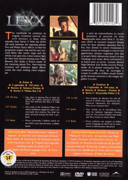 This worldwide hit continues its original, irreverent journey into sci-fi territory in these three episodes from Series 3. With the LEXX still stuck between the opposing planets Fire and Water, Stan's efforts to feed his gargantuan organic ship and his own outsized libido take center stage until the whole crew gets into a slow-motion fight for their lives. Award-winning actor Nigel Bennett (The Skulls) is Prince, leader of the menacing planet Fire. Awe-inspiring locations and ambitious digital effects create the most striking visual imagery yet.3.08 The Key - Stan plans to destroy Fire to feed the LEXX, but sudden amorous attention from Xev distracts him. But is it really Xev?3.09 Garden - Stan revels in this wondrous Water city, whose inhabitants supply him with a custom-made love interest. Xev finds the place seriously lacking. Kai finds a purpose.3.10 Battle - Prince commands a balloon attack on the LEXX crew that becomes a balletic battle.