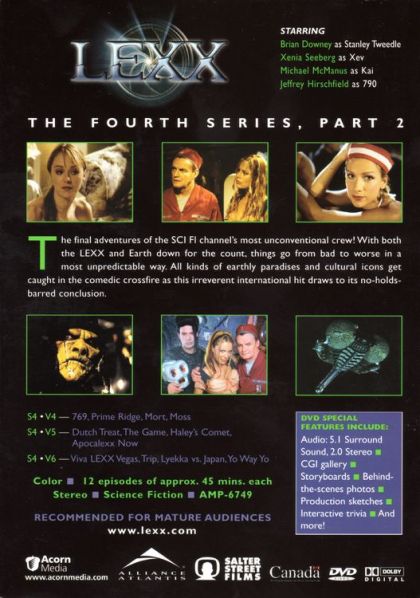 The final adventures of the SCI FI channel's most unconventional crew! With both the LEXX and Earth down for the count, things go from bad to worse in a most unpredictable way. All kinds of earthly paradises and cultural icons get caught in the comedic crossfire as this irreverent international hit draws to its no-holds-barred conclusion.Episodes include: 769Prime RidgeMortMossDutch TreatThe GameHaley's CometApocalexx NowViva LEXX VegasTripLyekka vs. JapanYo Way Yo.
