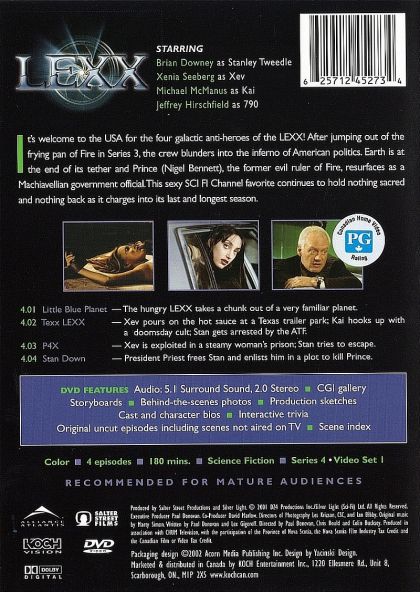 It's welcome to the USA fior the four galactic anti-heroes of the LEXX. After jumping out of the frying pan of Fire in Series3, the crew blunders into the inferno of AMerican politics. Earth is at the end of its tether and Prince (Nigel Bennett) the former evil ruler of Fire, resurfaces as a Machiavellian government official. This sexy SCI Fi Channel favorite continues to hold nothing sacred and nothing back as it charges into its last and longest season. 4.01 Little Blue Planet-The hungry LEXX takes a chunk out of a very familiar planet.4.02 Texx LEXX-Xev pours on the hot sauce at Texas trailer park; Kai hooks up with a doomsday cult; Stan gets arrested by the ATF.4.03 P4X-Xev is exploited in a steamy woman's prison; Stan tries to escape.4.04 Stan Down-President Priest frees Stan and enlists him in a plot to kill Prince.