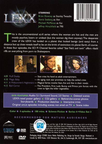 This is the unconventional sci-fi series where the women are hot and the men are mostly psychos, losers or undead (but the women dig them anyway). The desperate crew of the Lexx has landed on a planet that looked benign (and tasty) from a distance but up close reveals itself to be on the brink of extinction: it's planet Earth, of course. In these four episodes, the Sci Fi Channel favorite called Star Trek's evil twin, offers ribald riffs on everything from porn to Shakespeare. 4.09 Fluff Daddy - Stan tries his hand at adult entertainment. Xev meets a live Kai. 4.10 Magic Baby - An aging rockstar promises to help the exiled crew. 4.11 A Midsummer's Nightmare - The LEXX crew tangles with Oberon King of the Faries. 4.12 Bad Carrot - President Priest, Bunny, and Prince join forces with the LEXX crew to fight killer carrots.