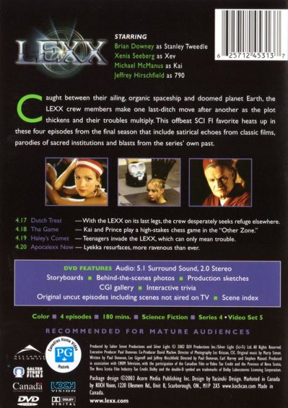 Caught between their ailing, oprganic spaceship and doomed planet Earth, the Lexx crew members make one last-ditch move after another as the plot thickens and their troubles multiply. This offbeat Sci-Fi Channel favorite heats u p in these four episodes from the final season that include satirical echoes from classic films, parodies of sacred institutions and blasts from the series' own past.4.17 Dutch Treat — With the LEXX on its last legs, the crew desperately seeks refuge elsewhere. 4.18 The Game — Kai and Prince play a high-stakes chess game in the "Other Zone." 4.19 Haley’s Comet — Teenagers invade the LEXX, which can only mean trouble. 4.20 Apocalexx Now — Lyekka resurfaces, more ravenous than ever.