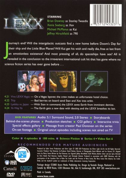 Journey's end! Will the intergalactic outcasts find a new home before Doom's Day for their ship and the Little Blue Planet? Will Kai get his wish and really die, free at last from an emotionless existence? And most pressing of all, do spaceships have sex? All is revealed in the conclusion to the irreverent international cult hit that has gone where no science fiction series has ever gone before...4.21 Viva LEXX Vegas — On a Vegas layover, the crew makes an unfortunate hotel choice. 4.22 Trip — Bad berries on board send Stan and Xev into orbit. 4.23 Lyekka vs. Japan — With Stan in command, the LEXX saves Earth from imminent demise. 4.24 Yo Way Yo — The Earth gets a new date with destiny, and the LEXX breathes its last.