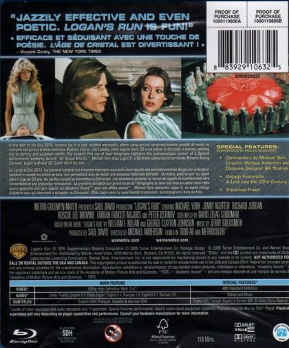 In the Year of the City 2274, humans live in a vast, bubbled metropolis, where computerized servo-mechanisms provide all needs so everyone can pursue endless hedonism. Endless, that is, until Lastday, when anyone who's 30 must submit to Carousel, a soaring, spinning trip to eternity and supposed rebirth. The screen's first use of laser holography highlights this post-apocalyptic winner of a Special Achievement Academy AwardÒ for Visual Effects. Michael York plays Logan 5, a Sandman authorized to terminate Runners fleeing Carousel. Logan is almost 30. Catch him if you can.