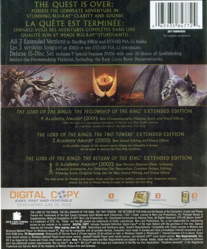 THE QUEST IS OVER:POSSESS THE COMPLETE ADVENTURE IN STUNNING BLU-RAY CLARITY AND SOUND!All 3 Extended Versions in Dazzling 1080p and DTS-HD MA 6.1 Audio.Deluxe 15-Disc Set Includes 9 Special Features DVD's with over 26 Hours of Spellbinding Behind-the-Moviemaking Material, Including the Rare Costa Botes Documentaries.THE LORD OF THE RINGS: THE FELLOWSHIP OF THE RING™ EXTENDED EDITION4 Academy Awards® (2001): Best Cinematography, Makeup, Score and Visual EffectsWith the help of a courageous Fellowship of friends and allies, Frodo embarks on a perilous mission to destroy the legendary One Ring.THE LORD OF THE RINGS: THE TWO TOWERS™ EXTENDED EDITION2 Academy Awards® (2002): Best Sound Editing and Visual EffectsIn the middle chapter of this historic movie trilogy, The Fellowship is broken, but it's quest to destroy the One Ring continues.THE LORD OF THE RINGS: THE RETURN OF THE KING™ EXTENDED EDITION11 Academy Awards® (2003): Best Picture, Director (Peter Jackson), Adapted Screenplay, Art Direction/Set Direction, Costume Design, Editing, Makeup, Score, Original Song Into The West, Sound Mixing and Visual EffectsThe final battle for Middle-earth begins, Frodo and Sam, led by Gollum, continue their dangerous mission toward the fires of Mount Doom in order to destroy the One Ring.