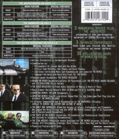 FROM THE CREATORS OF THE MATRIX TRILOGYDISC 1SIDE A: The Burly Man ChroniclesProfiles the "Society" of craftspeople, actors an filmmakers who devoted years of their lives to the movie trilogy and the Enter the Matrix console game.Preproduction - Alameda Shoot - Australia ShootGo deeper and Follow the White Rabbit to 3 documentary Pods revealing 21 featurettesSIDE B: The Roots of the MatrixReturn to Source: Philosophy & The MatrixThe Hard Problem: The Science behind the fictionInsightful documentaries that probe the historical, philosophical and technological inspirations of The Matrix trilogy.DISC 2The Zion ArchiveProduction assets developed for the Universe of The Matrix, including concept artwork, storyboards and drawingsThe Media of The Matrix: Music videos, TV spots and trailersRave ReelThe Matrix Online: Explore the future of The Matrix