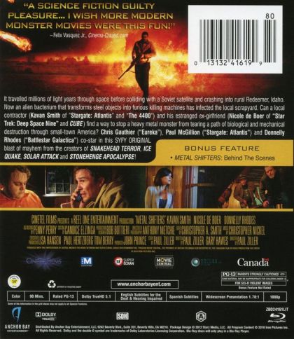 It travelled millions of light years through space before colliding with a Soviet satellite and crashing into rural Redeemer, Idaho. Now an alien bacterium that transforms steel objects into furious killing machines has infected the local scrap-yard. Can a local contractor (Kavan Smith of Stargate: Atlantis and The 4400) and his estranged ex-girlfriend (Nicole de Boer of Star Trek: Deep Space Nine and Cube) find a way to stop a heavy metal monster from tearing a path of biological and mechanical destruction through small-town America? Chris Gauthier (Eureka), Paul McGillion (Stargate: Atlantis) and Donnelly Rhodes (Battlestar Galactica) co-star in this SYFY Original blast of mayhem from the creators of Snakehead Terror, Ice Quake, Solar Attack and Stonehenge Apocalypse!