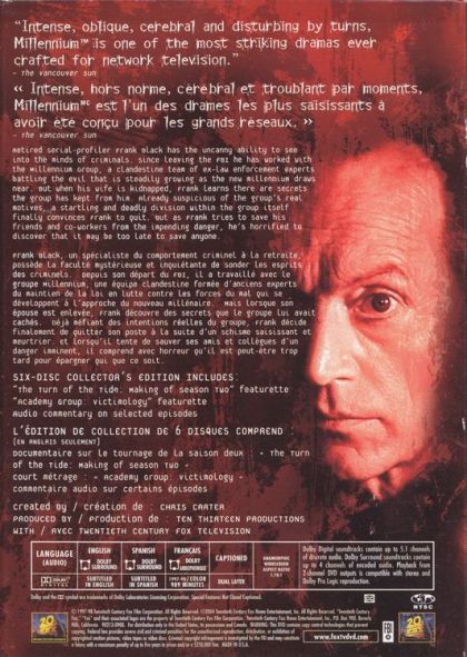 Retired serial-profiler Frank Black has the uncanny ability to see into the minds of criminals. Since leaving the FBI he has worked with the Millennium Group, a clandestine team of ex-law enforcement experts battling the evil that is steadily growing as the new millennium draws near. But when his wife is kidnapped, Frank learns that there are secrets the group has kept from him. Already suspicious of the group's real motives, a startling and deadly division within the group itself finally convinces Frank to quit. But as Frank tries to save his friends and co-workers from the impending danger, he's horrified to discover that it may be too late to save anyone. Frank Black, un spécialiste du comportement criminel à la retraite, possède la faculté mystérieuse et inquiétante de sonder les esprits des criminels. Depuis son départ du FBI, il a travaillé avec le groupe Millénium, un équipe clandestine formée d'anciens experts du maintien de la loi en lutte contre les forces du mal qi se développent à l'approche du nouveau millénaire. Mais lorsque son épouse est enlevée, Frank découvre des secrets que le groupe lui avait cachés. Déjà méfiant des intentions réelles du groupe, Frank décide finalement de quitter son poste à la suite d'un schisme saisissant et meurtrier. Et lorsqu'il tente de sauver ses amis et collèques d'un danger imminent, il comprend avec horreur qu'il est peut-être trop tard pour épargner qui que ce soit.