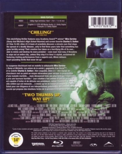 This electrifying thriller features sexy Academy Award winner Mira Sorvino (Romy And Michele's High School Reunion) and screen favorite Charles S. Dutton (A Time To Kill, Alien 3)! A team of scientists discover a miracle cure that stops the spread of a deadly disease... only to find three years later that something has gone terribly wrong! Their creation has taken on a horrifying life of its own... able to mimic and destroy its every predator - even man! And now, it threatens to wipe out an entire city... unless they stop it in time! A stylish, acclaimed hit featuring riveting performances from a superb cast, Mimic delivers heart-pounding thrills that never let up!