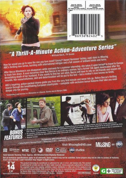 How far would you go to save the one you love most? Emmy Award Nominee Ashley Judd stars in Missing, ABC’s thrilling new series, bursting with international intrigue and a full season of brilliant twists and turns.After Becca Winstone’s son disappears while overseas for a summer internship, she takes it upon herself to travel to Europe to track him down. It soon becomes clear that Becca is no ordinary woman, but a former CIA agent deactivated after the devastating death of her husband. If she wants to find her son alive, Becca will have to rely on old friends…and old enemies…thus reopening old wounds. Her resourcefulness, skill and determination will be put to the test – but a mother’s love knows no limits.ABC’s inspiring, action-packed drama grabs you from the very first minute and never lets go. This DVD set includes exclusive bonus features, plus interviews with star Ashley Judd and the show’s creators, in a three-disc DVD set.