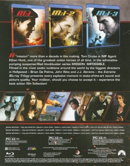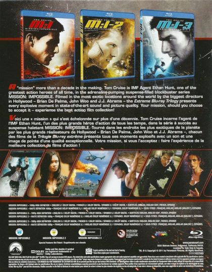 A "mission" more than a decade in the making. Tom Cruise is IMF Agent Ethan Hunt, one of the greatest action heroes of all time, in the adrenaline-pumping suspense-filled blockbuster series MISSION: IMPOSSIBLE. Filmed in the most exotic locations around the world by the biggest directors in Hollywood - Brian De Palma, John Woo and J.J. Abrams - the Extreme Blu-ray Trilogy presents every explosive moment in state-of-the-art sound and picture quality. Your mission, should you choose to accept it - experience the best action film collection!Voici une « mission » qui s'est échelonnée sur plus d'une décennie. Tom Cruise incarne l'agent de l'IMF Ethan Hunt, l'un des plus grands héros d'action de tous les temps, dans la série à succès au suspence haletant MISSION: IMPOSSIBLE. Tourné dans les endroits les plus exotiques de la planète par les plus grands réalisateurs de Hollywood - Brian De Palma, John Woo and J.J. Abrams -, chacun des films de la triligie Blu-ray extrême présente tous ses moments explosifs avec un son et une image de pointe d'une qualité exceptionnelle. Votre mission, si vous l'acceptez : faire l'expérience de la meilleure collection de film d'action !