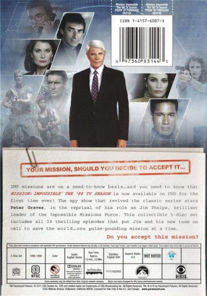 IMF missions are on a need-to-know basis... and you need to know that MISSION: IMPOSSIBLE THE '88 TV SEASON is now available on DVD for the first time every! The spy show that revived the classic series starts Peter Graves, in the reprisal of his role as Jim Phelps, brilliant leader of the Impossible Missions Force. This collectibale 5-disc set includes all 19 thrilling episodes that put Jim and his new team on call to save the world... one pulse-pounding mission at a time.Do you accept this mission?