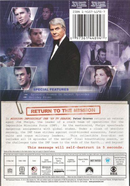 In MISSION: IMPOSSIBLE™ THE '89 TV SEASON, Peter Graves returns as veteran agent Jim Phelps, the leader of a crack team of operatives for the Impossible Missions Force (IMF). As the mastermind, Phelps spearheads dangerous assignments with global stakes. Under a cloak of absolute secrecy, the IMF team strikes against cold-blooded assassins, fanatical cults and rogue military leaders. This collectible four-disc set includes all 16 episodes of the series' final breathtaking season, as the challenges take the IMF team to the ends of the Earth... and beyond!