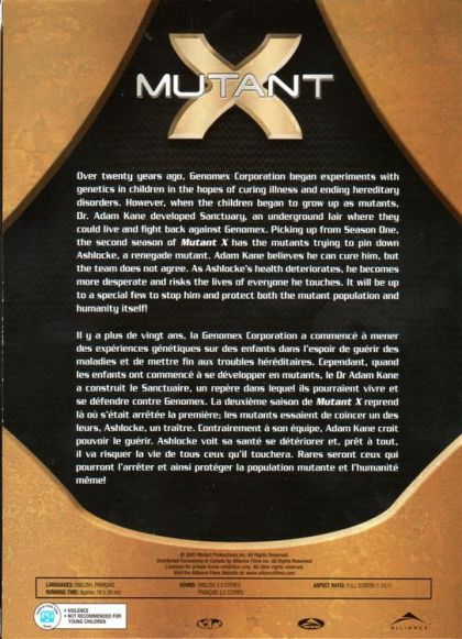 Over twenty years ago, Genomex Corporation began experiments with genetics in children in the hopes of curing illness and ending hereditary disorders. however, when the children began to grow up as mutants, Dr. Adam Kane developed Sanctuary, an underground lair where they could live and fight back against Genomex. Picking up from Season One, the second season of Mutant X has the mutants trying to pin down Ashlocke, a renegade mutant. Adam Kane believes he can cure him, but the team does not agree. As Ashlocke's health deteriorates, he becomes more desperate and risks the lives of everyone he touches. it will be up to a special few to stop him and protect both themutant population and humanity itself!