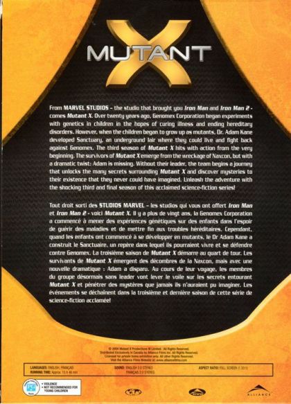 From Marvel Studios - The studio that brought you Iron Man and Iron man 2 - comes Mutant X.Over twenty years ago, Genomex Corporation began experiments with genetics in children in the hopes of curing illness and ending hereditary disorders. However, when the children began to grow up as mutants, Dr. Adam Kane developed Sanctuary, an underground lair where they could live and fight back against Genomex. The third season of Mutant X hits with action from the very beginning. The survivors of Mutant X emerge from the wreckage of Naxcon, but with a dramatic twist: Adam is missing. Without their leader, the team begins a journey that unlocks the many secrets surrounding Mutant X and discover mysteries to their existence that they never could have imagined. Unleash the adventure with the shocking third and final season of this acclaimed science-fiction series!