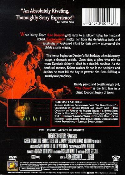 "An Absolutely Riveting Thoroughly Scary Experience!" -Los Angeles TimesWhen Kathy Thorn (Lee Remick) gives birth to a stillborn baby, her husband Robert (Gregory Peck) shields her from he devastating truth and substitutes an orphaned infant for their own -- unaware of the child's satanic origins.The horror begins on Damien's fifth birthday when his nanny stages a dramatic suicide. Soon after, a priest who tries to warn Damien's father is killed in a freakish accident. As the death toll mounts, Robert realizes his son is the Antichrist and decides he must kill the boy to prevent him from fulfilling a cataclysmic prophecy.Briskly paced and breathtakingly evil, The Omen is the first film in a classic four-part legacy of terror.