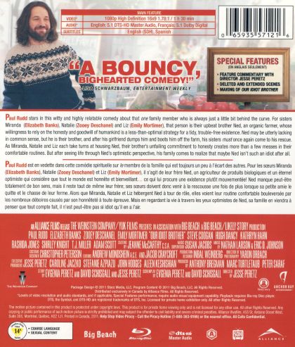 Paul Rudd stars in this witty and highly relatable comedy about that one family member who is always just a little bit behind the curve. For sisters Miranda (Elizabeth Banks), Natalie (Zooey Deschanel) and Liz (Emily Mortimer), that person is their upbeat brother Ned. an organic farmer, whose willingness to rely on the honesty and goodwill of humankind is a less-than-optimal strategy for a tidy, trouble-free existence. Ned may be utterly lacking in common sense, but he is their brother, and after his girlfriend dumps him and boots him off the farm, his sisters must once again come to his rescue. As Miranda. Natalie and Liz each take turns at housing Ned. their brother's unfailing commitment to honesty creates more than a few messes in their comfortable routines. But after seeing life through Ned's optimistic perspective, his family comes to realize that maybe Ned isn't such an idiot after all.Paul Rudd est en vedette dans cette comédie spirituelle sur to membre de la famille qui est toujours un peu a l'écart des autres. Pour les soeurs Miranda (Elizabeth Banks). Natalie (Zooey Deschanel) et Liz (Emily Mortimer), it s'agit de leur frère Ned, un agriculteur de produits biologiques et un éternel optimiste qui considère que tout le monde est honnête et bienveillant... ce qui lui procure une existence plutôt mouvementée! Ned manque peut-être totalement de bon sens, mais it reste tout de même leur frère: ses soeurs doivent donc venir a la rescousse une fois de plus lorsque sa petite amie le quitte et le chasse de leur ferme. Alors que Miranda, Natalie et Liz hébergent Ned a tour de de, elles voient leur routine confortable bouleversée par les nombreux déboires causes par son honnêteté a toute épreuve. Mais en regardant la vie a travers les yeux optimistes de Ned, sa famille en viendra a penser que tout compte fait, il n'est peut-être pas si idiot qu'il en a l'air.