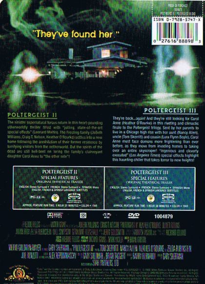 Poltergeist II:The sinister supernatural forces return in this heart-pounding otherworldly thriller filled with "jolting, state-of-the-art special effects" (Leonard Maltin). The Freeling family settles into a new home following the annihilation of their former residence by terrifying visitors from the netherworld. But the spirits of the dead are still hell-bent on luring the family's clairvoyant daughter Carol Anne to "the other side".Poltergeist III:They're back... again! And they're still looking for Carol Anne in this riviting and climactic finale to the Poltergeist trilogy. Sent by her parents to live in a Chicago high rise with her aunt, uncle and cousin, Carol Anne must face demos more frightening than ever before, as they move from invading homes to taking over an entire skyscraper! "Ingenius and cleverly executed" (Los Angeles Times) special effects highlight this haunting chiller that takes terror to new heights!