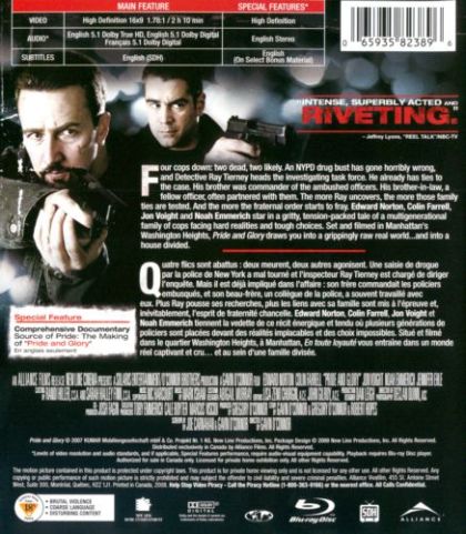 Four cops down: two dead, two likely. An NYPD drug bust has gone horribly wrong, and Detective Ray Tierney heads the investigating task force. He already has ties to the case. His brother was commander of the ambushed officers. His brother-in-law, a fellow officer, often partnered with them. The more Ray uncovers, the more those family ties are tested. And the more the fratenal order starts to fray. Edward Norton, Colin Farrell, Jon Voight and Noah Emmerich star in gritty, tesion-packed tale of a multigenerational family of cops facing hard realities and tough choices. Set and filmed in Manhattan's Washington Heights, Pride and Glory draws you into a grippingly raw real world...and into a house divided.