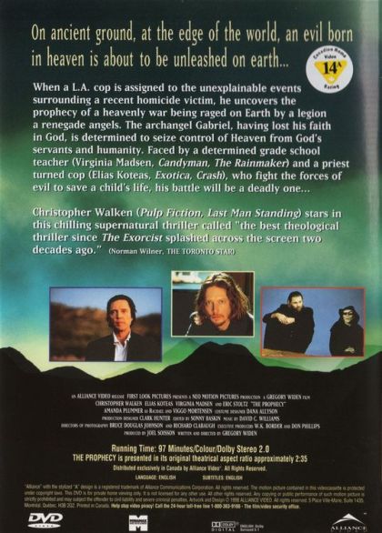 On ancient ground, at the edge of the world, an evil born in heaven is about to be unleashed on earth....When a L.A. cop is assigned to the unexplainable events surrounding a recent homicide victim, he uncovers the prophecy of a heavenly war being raged on Earth by a legion of renegade antels. The archangel Gabriel, having lost his faith in God, is determined to seize control of Heaven from God's servants and humanity. Faced by a determined grade school teacher (Virginia Madsen, Candyman, The Rainmaker) and a priest turned cop (Elias Koteas, Exotica, Crash), who fight the forces of evil to save a child's life, his battle will be a deadly one...Christopher Walken (Pulp Fiction, Last Man Standing) stars in this chilling supernatural thriller called "The best theological thriller since The Exorcist splashed across the screen two decades ago." (norman Wilner, The Toronto Star)