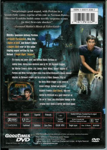 It's 22 years later, and Norman Bates (Perkins) is coming home, having been declared sane by Dr. Bill Raymond (Loggia), but Marion Crane's sister, Lila Loomis (Miles), doesn't believe it. Perkins and Miles recreate their roles from Alfred Hitchcock's classic shower shocker, as Norman's return and the arrival of Mary Samuels (Tilly) at the Bates Motel trigger a new wave of brutal killings. Holland and director Richard Franklin, who was invited by Hitchcock as a guest observer on the set of Topaz, pay affectionate homage to the original film's blend of horror and black humor.