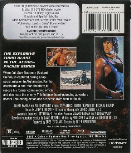 When Col. Sam Trautman (Richard Crenna) is captured during a top-secret mission in Afghanistan, Rambo erupts into a one-man firestorm to rescue his former commanding officer and decimate the enemy. This intese, heat-pounding adventure boasts unrelending action and suspense from start to finish.Lorsque le Colonel Sam Tutman (Richard Crenna) est capturé lors d'une mission ultrasecrète en Afghanistan, Rambo s'engage, suel, dans un combat fulgurant pour libérer son ex-commandant et écraser l'ennemi. Cette aventure des plua palpitantes est un véritable feu roulant d'action et de suspense du début à la fin.