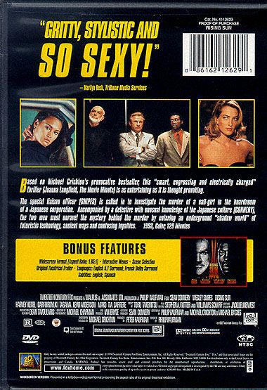 Based on Michael Crichton’s provocative bestseller, this “smart, engrossing and electrically charged” thriller (Joanna Langfield, The Movie Minute) is as entertaining as it is thought provoking.The special liaison officer (Snipes) is called in to investigate the murder of a call-girl in the boardroom of a Japanese corporation. Accompanied by a detective with unusual knowledge of the Japanese culture (Connery), the two men must unravel the mystery behind the murder by entering an underground “shadow world” of futuristic technology, ancient ways and confusing loyalties.