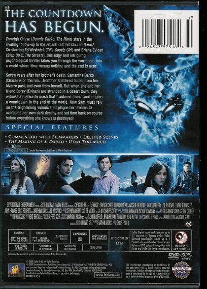 Daveigh Chase (Donnie Darko, The Ring) stars in the riveting follow-up to the smash cult hit Donnie Darko! Co-starring Ed Westwick (TV’s Gossip Girl) and Briana Evigan (Step Up 2: The Streets), this edgy and intriguing psychological thriller takes you through the wormhole into a world where time means nothing and the end is near!Seven years after her brother’s death, Samantha Darko (Chase) is on the run…from her shattered home, from her bizarre past, and even from herself. But when she and her friend Corey (Evigan) are stranged in a desert town, they witness a meteorite crash that fractures time…and begins a countdown to the end of the world. Now Sam must rely on the frightening visions that plague her dreams to overcome her dark destiny and set time back on course before everything she knows is destroyed!