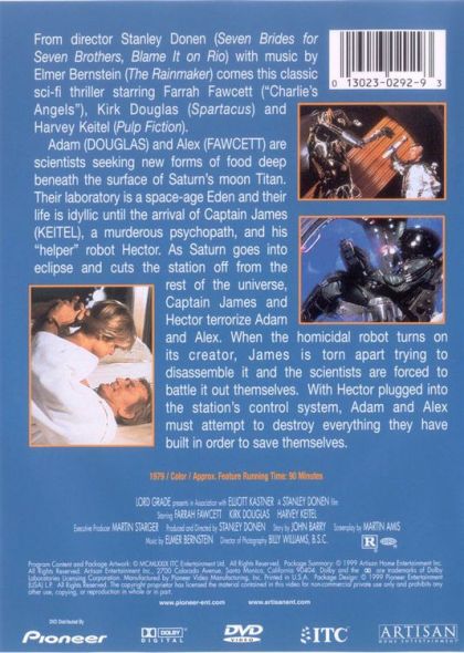 From director Stanley Donen (Seven Brides for Seven Brothers, Blame It on Rio) with music by Elmer Bernstein (The Rainmaker) comes this classic sci-fi thriller starring Farrah Fawcett ("Charlie's Angels"), Kirk Douglas (Spartacus) and Harvey Keitel (Pulp Fiction). Adam (DOUGLAS) and Alex (FAWCETT) are scientists seeking new forms of food deep beneath the surface of Saturn's moon Titan. Their laboratory is a space-age Eden and their life is idyllic until the arrival of Captain James (KEITEL), a murderous psychopath, and his "helper" robot Hector. As Saturn goes into eclipse and cuts the station off from the rest of the universe, Captain James and Hector terrorize Adam and Alex. When the homicidal robot turns on its creator, James is torn apart trying to disassemble it and the scientists are forced to battle it out themselves. With Hector plugged into the station's control system, Adam and Alex must attempt to destroy everything they have built in order to save themselves.