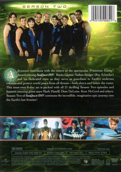 Beneath The Surface Lies The Future.Adventure resurfaces with the return of the spectacular Primetime Emmy Award-winning SeaQuest DSV. Rejoin Captain Nathan Bridger (Roy Scheider) and his dedicated crew as they serve as guardians to Earth's undersea colonies and protect world peace from all threats - both above and below the water. This must-own 8-disc set is packed with all 21 thrilling Season Two episodes and features amazing guest stars Mark Hamill, Dom DeLuise, Kent McCord and others. Season Two of SeaQuest DSV continues the incredible, imaginative epic journey into the Earth's last frontier!