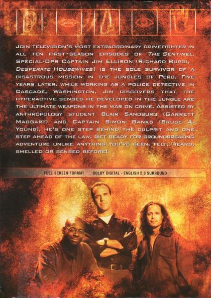 Join television's most extraordinary crimefighter in all ten first-season episodes of The Sentinel. Special-Ops Captain Jim Ellison (Richard Burgi, Desperate Housewives) is the sole survivor of a disastrous mission in the jungles of Peru. Five years later, while working as a police detective in Cascade, Washington, Jim discovers that the hyperactive senses he developed in the jungle are the ultimate weapons in the war on crime. Assisted by anthropology student Blair Sandburg (Garrett Maggart) and Captain Simon Banks (Bruce A. Young), he's one step behind the culprit and one step ahead of the law. Get ready for groundbreaking adventure unlike anything you've seen, felt, heard, smelled or sensed before.