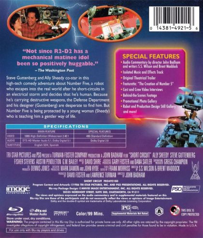 Number Five is alive!Steve Guttenberg and Ally Sheedy co-star in this high tech comedy adventure about Number Five, a robot who escapes into the real world after he short circuits in an electrical storm and decides that he's human. Because he's carrying destructive weapons, the Defense Department and his designer (Guttenberg) are desperate to find him. But Number Five is being protected by a young woman (Sheedy) who is teaching him a gentler way of life.