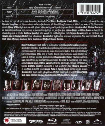 An amazing cast of big-screen favourites is directed by Robert Rodriguez (Desperado, From Dusk Till Dawn), Frank Miller - an special guest director Quentin Tarantino (Kill Bill 1 and 2, Pulp Fiction) - in an acclaimed and visually stunning hit that's the coolest movie of the year! Straight from the pages of Miller's hip series of Sin City graphic novels, Bruce Willis stars as a cop with a bum ticker and a vow to protect a sexy stripper (Jessica Alba - Fantastic Four); Mickey Rourke (Man On Fire) as an outcast misanthrope on a mission to avenge the death of his one true love (Jaime King - Pearl Harbour); and Clive Owen (King Arthur) as Dwight, the clandastine love of Shellie (Brittany Murphy - Little Black Book), who spends his night defending Gail (Rosario Dawson - The Devil'S Rejects) and her Old Town girls (Devon Aoki and Alexis Bledel) from a tough guy (Benicio Del Toro - 21 Grams) with a penchant for violence. Also starring Elijah Wood, Nick Stahl, Michael Madsen, Carla Gugino and Michael Clarke Duncan.