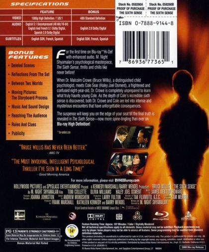 For the first time on Blu-ray Hi-Def with enhanced audio, M. Night Shyamalan's psychological masterpiece, The Sixth Sense, thrills and chills like never before! When Dr. Malcolm Crowe ( Bruce Willis), a distinguished child psychologist, meets Cole Sear (Haley Joel Osment), a frightened and confused eight-year-old...Dr. Crowe is completely unprepared to learn the truth of what haunts young Cole. With a riveting intensity you'll find thoroughly chilling and utterly unforgettable, this discovery of Cole's incredible 6th sense leads them both to mysterious and unforeseeable consequences! The suspense will keep you on the edge of your seat till the final truth is revealed in The Sixth Sense - now more spine tingling than ever on Blu-ray High Definition!