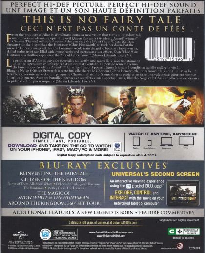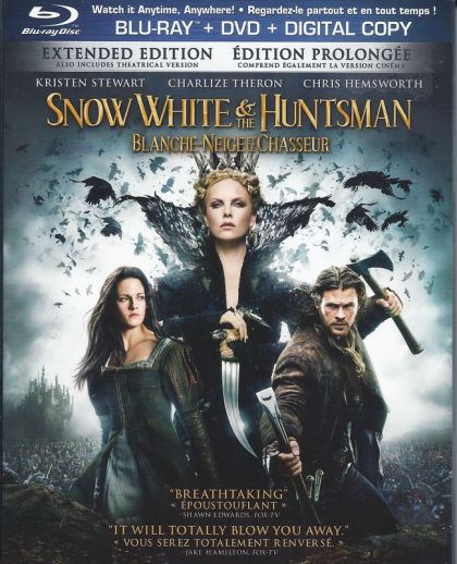 From the producer of Alice in Wonderland comes a new vision that turns a legendary tale into an action-adventure epic. The evil Queen Ravenna (Academy Award® winner Charlize Theron) will rule forever if she can take the life of Snow White (Kristen Stewart), so she dispatches the Huntsman (Chris Hemsworth) to track her down. But the wicked ruler never imagined that the Huntsman would train the girl to become a brave warrior, skilled in the art of war. Filled with intense battles and spectacular visual effects, Snow White & the Huntsman is a thrilling experience that "shouldn't be missed" (Shawn Edwards, Fox-TV).Le producteur d'Alice au pays des merveilles nous offre une nouvelle vision transformant un conte légendaire en une épopée d'action et d'aventure. La perfide reine Ravenna (la lauréate des Academy Award Charlize Theron) pourra régner à jamais à condition qu'elle enlève la vie à Blanche-Neige (Kristen Stewart); à cette fin, elle charge le Chasseur (Chris Hemsworth) de retrouver la jeune fille. Mais la terrible souveraine ne se doutait pas que le Chasseur allait plutôt entraîner sa proie et en faire une valeureuse guerrière rompue à l'art de la guerre. Avec ses batailles intenses et ses effets visuels spectaculaires, Blanche-Neige et le Chasseur offre une expérience trépidante « à ne pas manquer » (Shawn Edwards, Fox-TV).