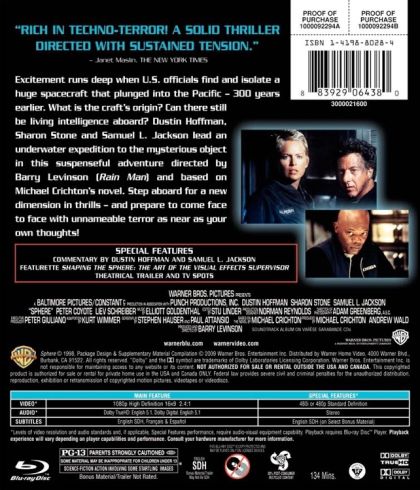 Excitement runs deep when U.S. officials find and isolate a huge spacecraft that plunged into the Pacific - 300 years earlier. What is the craft's origin? Can there still be living intelligence aboard? Dustin Hoffman, Sharon Stone and Samuel L. Jackson lead an underwater expedition to the mysterious object in this suspenseful adventure directed by Barry Levinson (Rain Man) and based on Michael Crichton's novel. Step aboard for a new dimension in thrills - and prepare to come face to face with unnameable terror as near as your own thoughts!